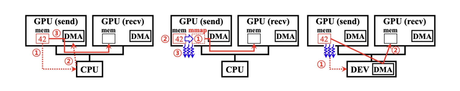DEV refers to any kinds of devices that can implement our DMA engine. that invokes the callback function of the triggered event. In TensorFlow, it takes ∼58.7μs for the callback thread to acquire the mutex lock from when it is released by the polling thread. This delay could be reduced to as low as 5μs if both threads are running on the same CPU core, but co-locating the threads or even merging them into a single one would increase the event polling interval as well as the overall processing time. Lastly, it is inefficient for the callback thread to deliver the computation command to GPU B. Delivering the event signal to GPU B would take only 2∼3μs if implemented efficiently, 2μs but we need to deliver the callback command binary as well. This extra delay could be avoided if we can deliver the GPU command ahead of time and trigger it later on the CPU side, but this is not supported by commodity GPU.